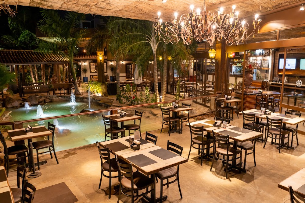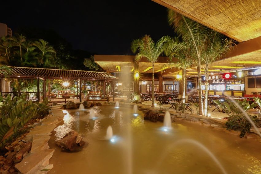 Variedade de pratos com diversos cortes de carne e acompanhamentos, lanches e drinques, em espaço temático.