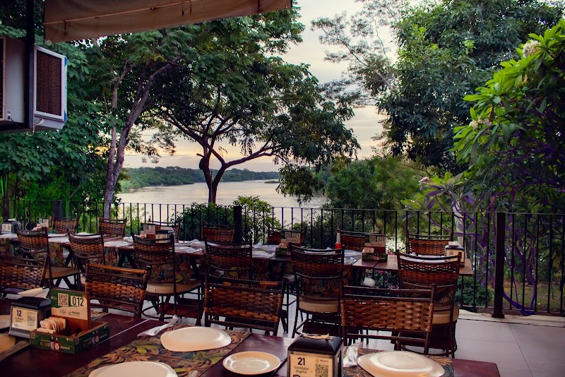 Rodízio de pizza e peixes grelhados em um espaço com ambiente familiar e mesas no deque à beira-rio.